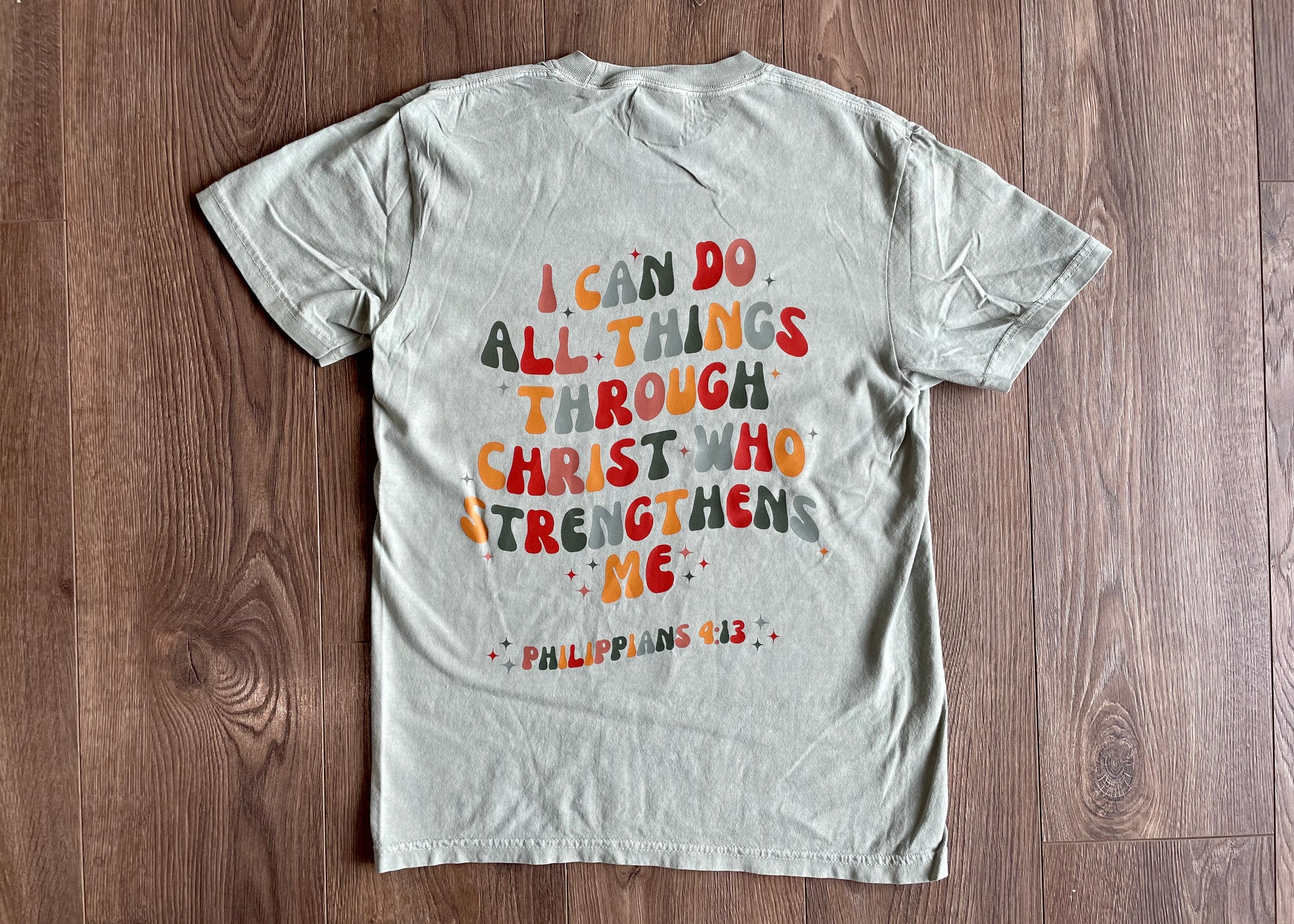 I can do all things through Christ Tee made with DTF Transfer on our Comfort Colours T-Shirt