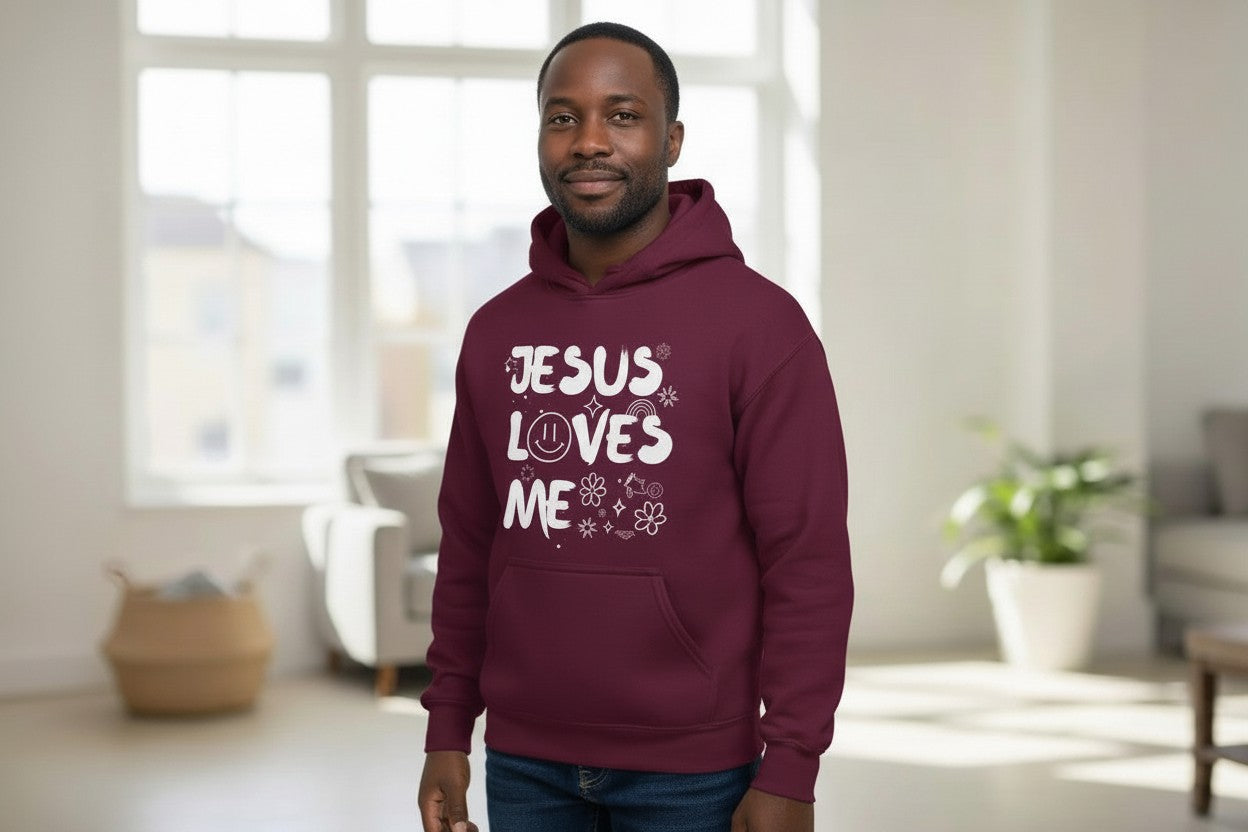 Jesus Loves Me Adult Size Graphic Hoodie made with DTF Transfer on our Gildan Hoodies.