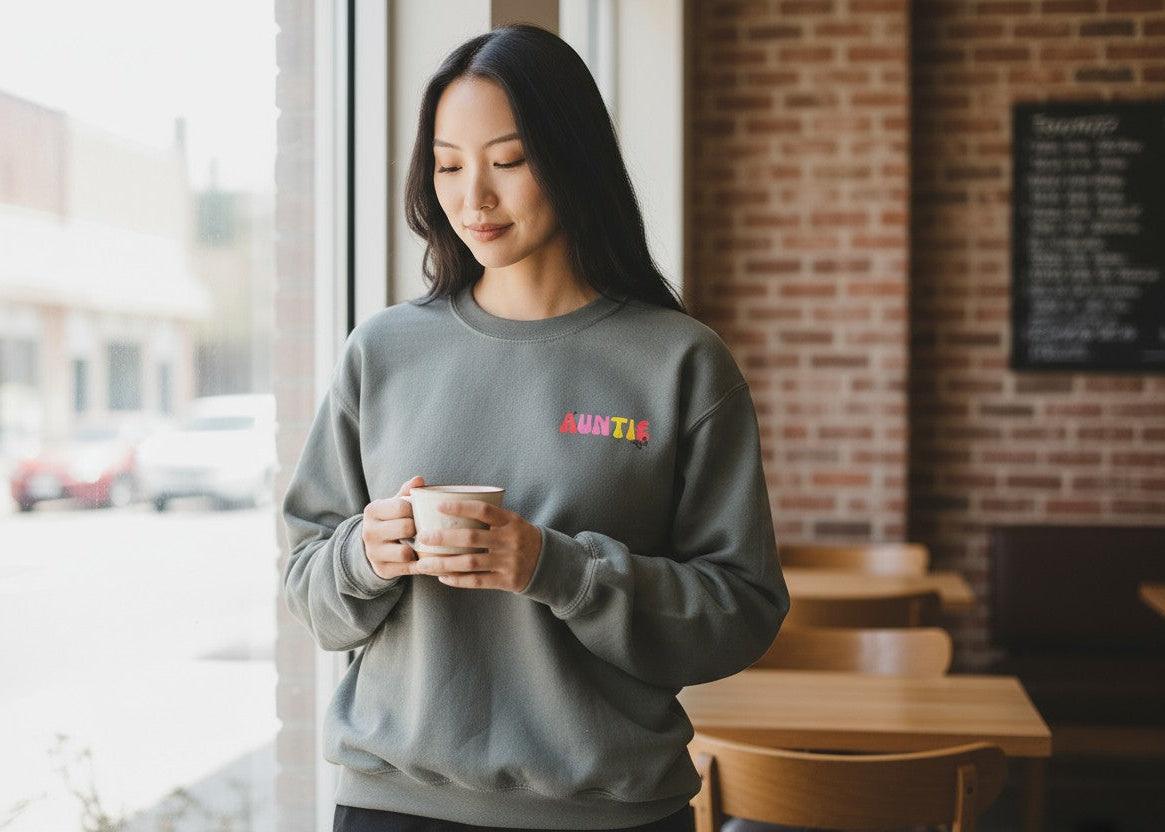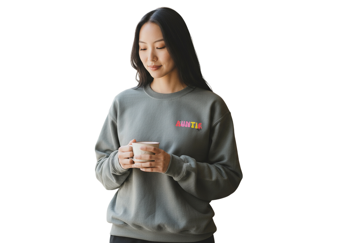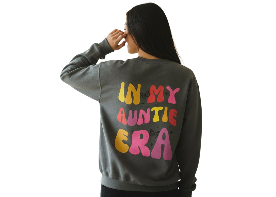 In My Auntie Era Sweater made with DTF Transfer on our Gildan Sweaters