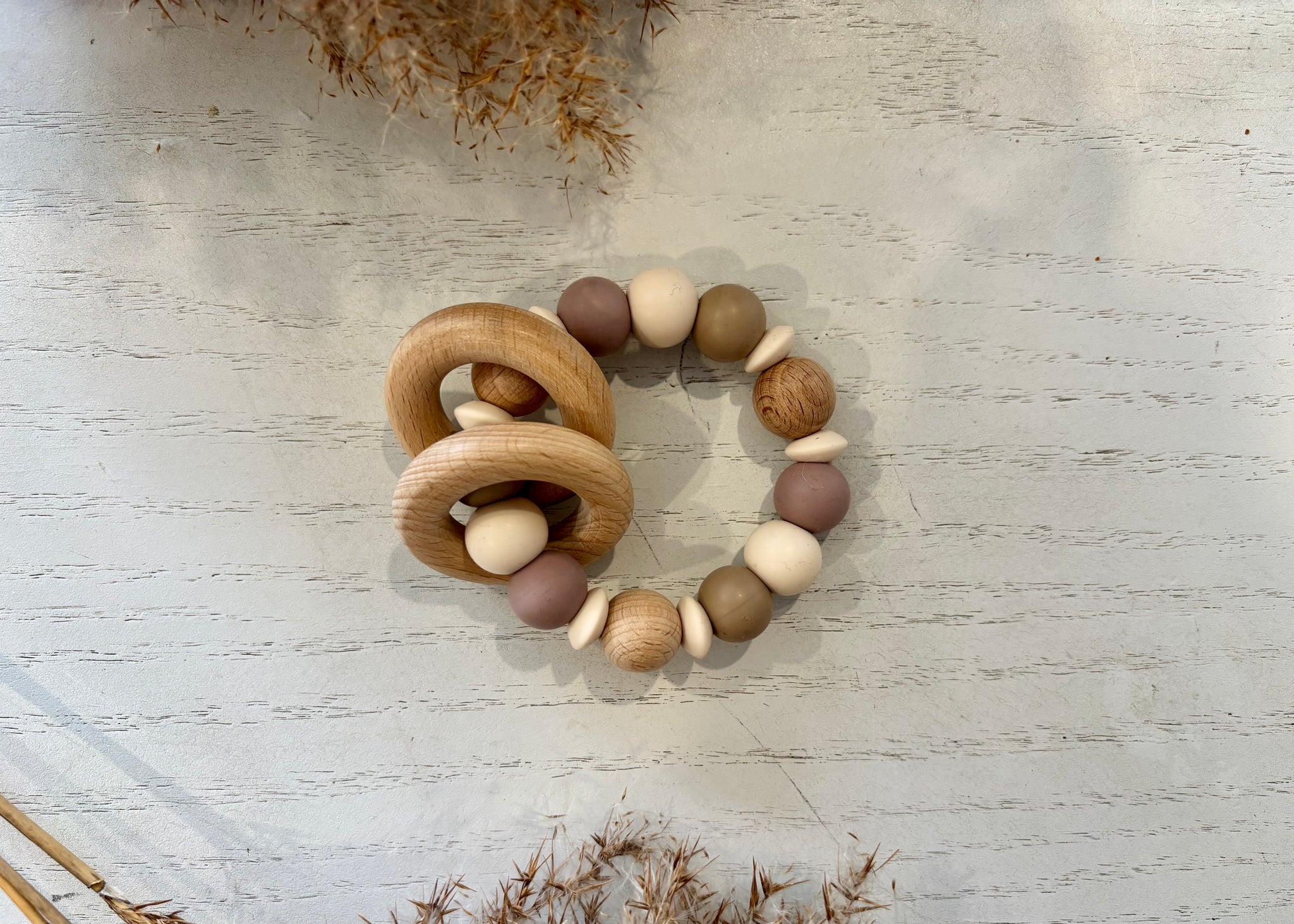 Handmade teething ring with beech wood rings, perfect for your little ones gums when teething.